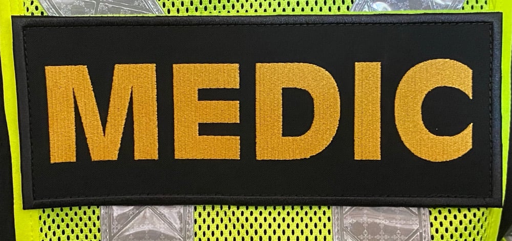 Svart/Gul text: 25x10cm bred ryggplatta med kardborrbaksida och med texten "MEDIC" (ny version 2025)