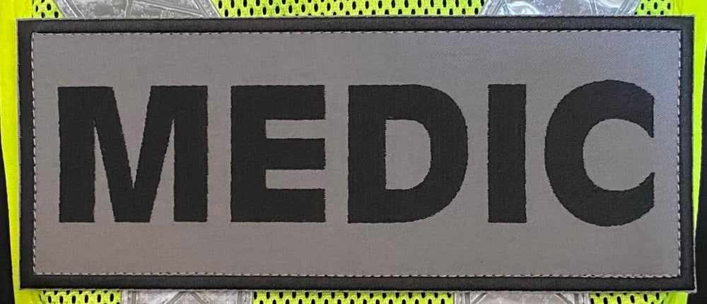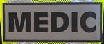 Gra/Svart text: 25x10cm bred ryggplatta med kardborrbaksida och med texten "MEDIC" (ny version 2025)